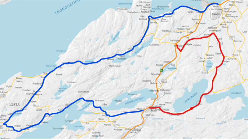 - Via Frosta mellom Hotran (fylkesvegene 753, 6822 og 6818 til Åsen (fylkesveg 753)